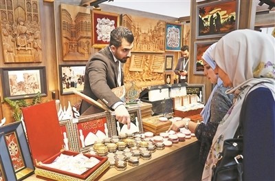 r展商向参观者介绍伊拉克礼品盒。 本报中东中心分社 伊纳斯·易卜拉欣摄